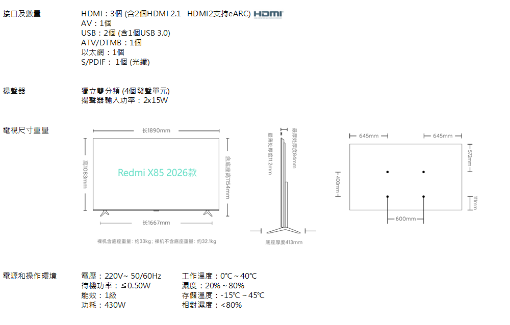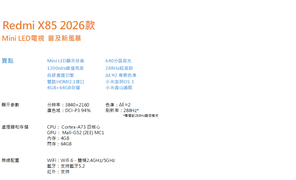 Redmi電視X85 2026款 4+64GB (水貨) 免開機廣告版*