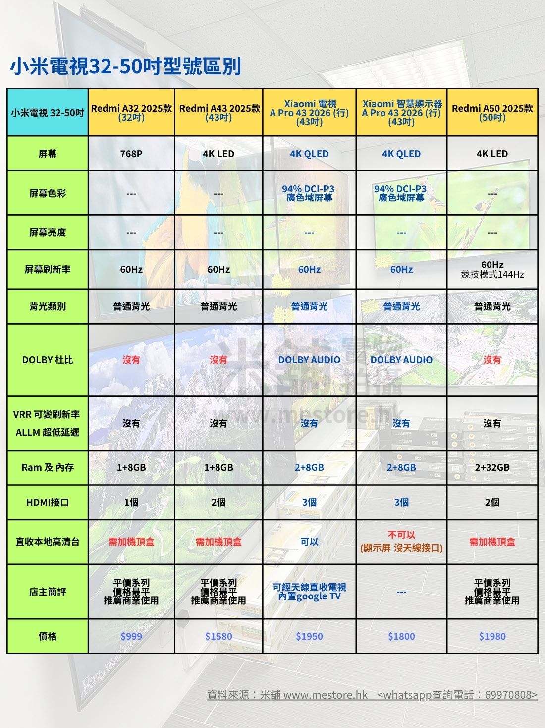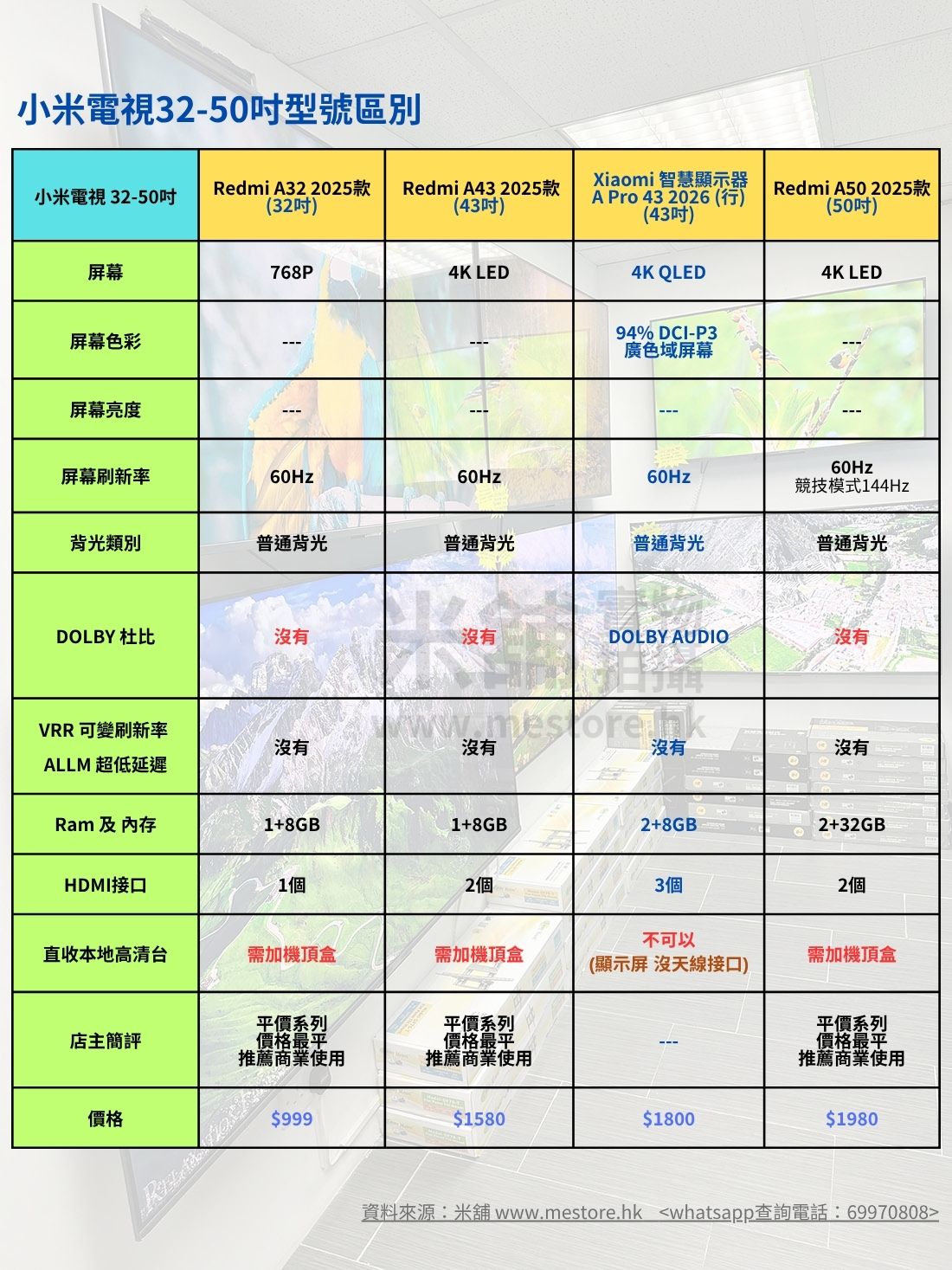 小米電視50吋 現時只有以下一款,需加機頂盒收看香港數碼電視頻道,如空間足夠建議選55吋,55吋有較多型號選擇,而且大部份都可經天線直收香港電視,50及55吋都是4K畫質的