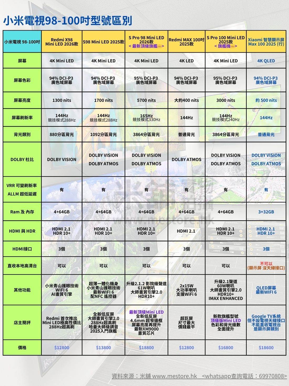 ● 最新性價比之皇 Redmi X98 Mini LED 2026款【水貨】【機價$12800】,Redmi 首次推出入門Mini LED,最新最平最抵玩,880分區背光,1300nits峰值亮度,94% DCI-P3廣色域,競技模式可達288Hz刷新率,WiFi 6,4+64GB內存,支持VRR可變刷新率,ALLM自動低延時,可經天線直收香港電視台